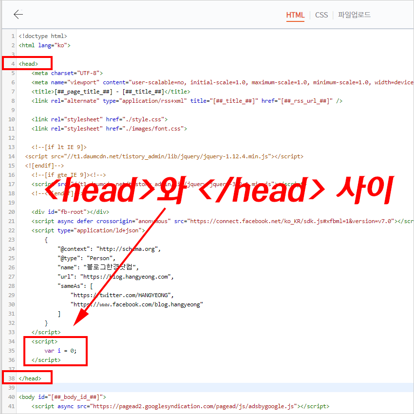 2. <head>와 </head> 사이에 스크립트를 복사해 붙여넣기로 넣어준다.