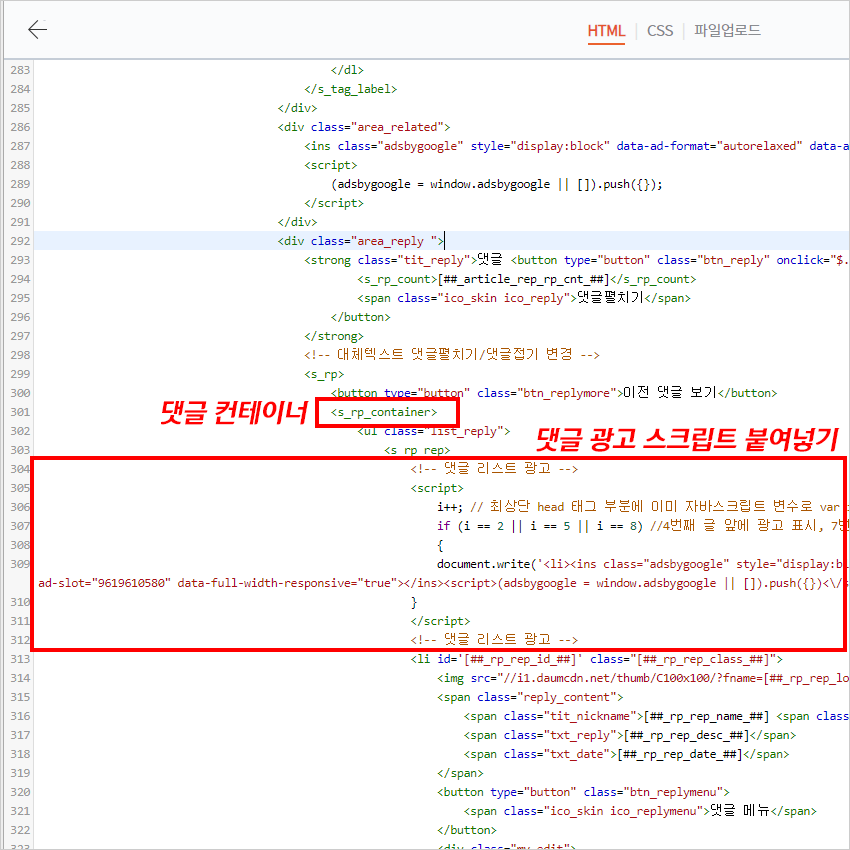 댓글 컨테이너를 내에 애드센스 광고 스크립트 붙여넣기