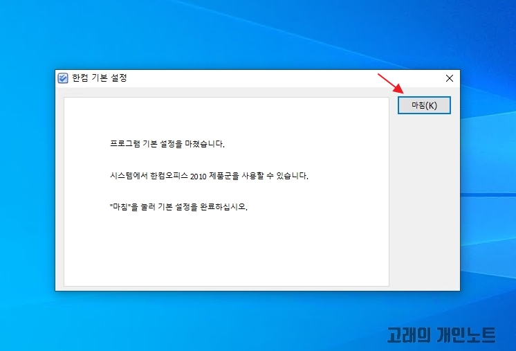 16. 마침 버튼을 누르면 한글 2010을 사용할 수 있게 되며 바탕화면에 한컴 사전, 한컴 타자연습도 같이 설치된것을 알 수 있습니다.