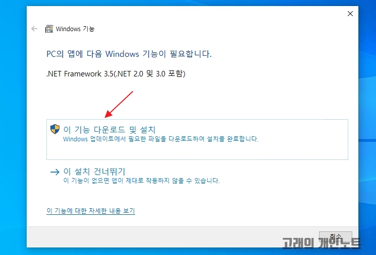 5. 윈도우 기능에서 Net Framework 3.5 설치 창이 뜨면 이 기능 다운로드 및 설치를 눌러서 필요한 파일을 다운로드 하도록 합니다.