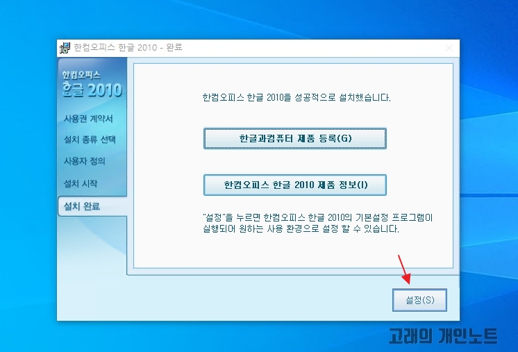 14. 한글 2010을 정상적으로 설치했습니다. 이어서 설정을 눌러 한컴오피스를 사용하위한 단계를 거치도록 합니다.