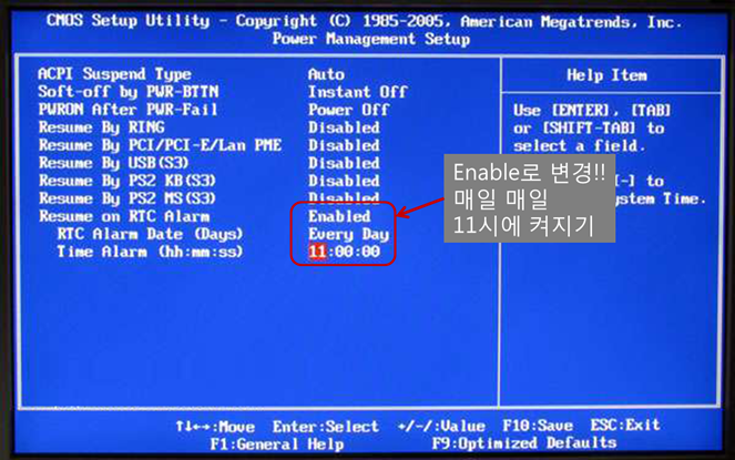 또는 RTC Alarm Resume / Wake On RTC Timer 으로 되어 있을 수도 있습니다.