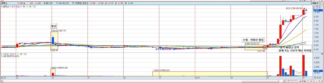 - 종가60일선 위에서 마감으로 보이면 종가매수 후 이평선 정배열시 홀딩(재료가 살아있는 종목에서 홀딩)