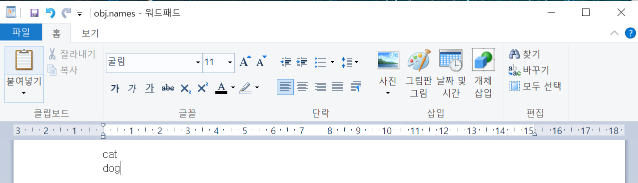 obj.names에 기존에 작성된 air, bird를 지우고 cat, dog를 작성합니다.