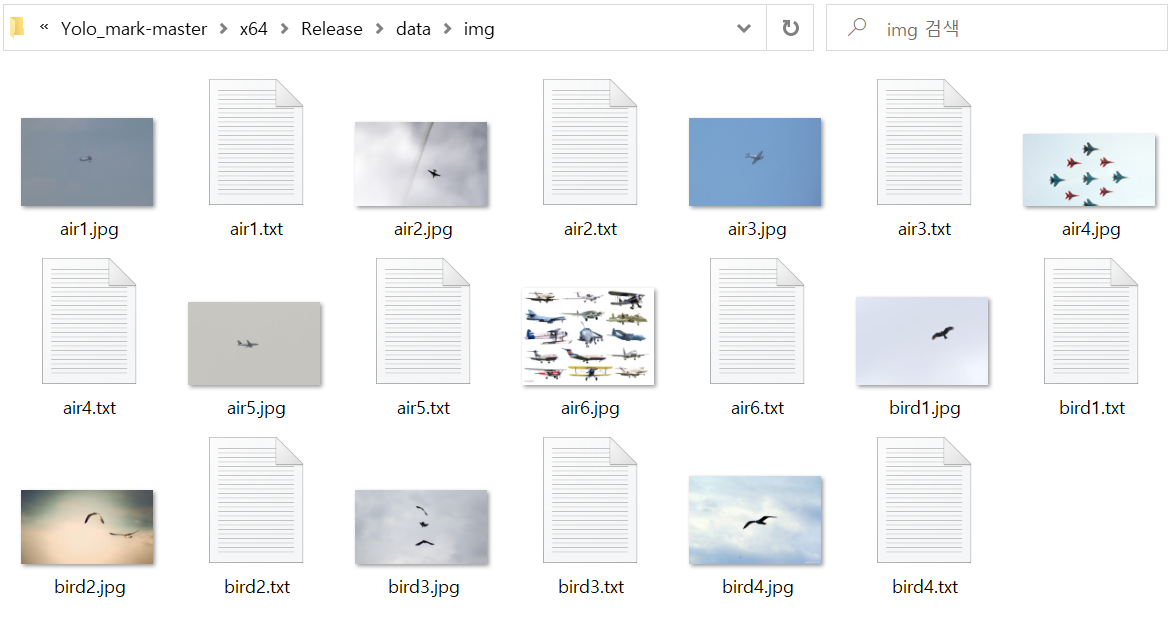 img 폴더에는 아래 사진과 같이 라벨링할 이미지와 라벨링 좌표가 들어있는 txt파일이 있습니다.