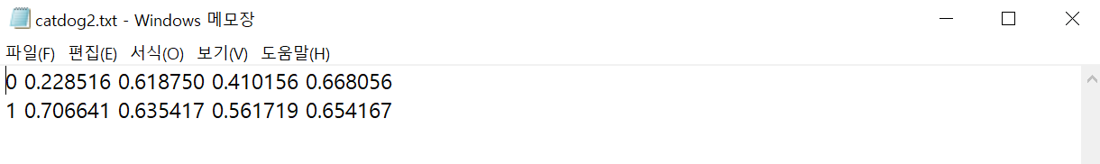 txt 파일은 [class id][center x][center y][w][h]로 구성됩니다.